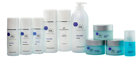 Без внимания нельзя оставить серию препаратов бренда Холи Ленд под одноименным названием AZULENE. Эта линия разработана для ухода за чувствительной кожей. Средства AZULENE предназначена для того, чтобы успокоить раздраженную кожу, убрать шелушение и сухость с сухой кожи. Вся косметика линии уменьшает воспаления, повышает скорость заживления повреждений и стимулирует регенеративные функции эпидермиса.