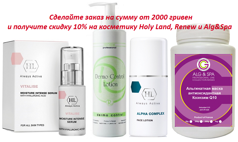 С 18 до 31 декабря 2017 года сделайте заказ на сумму от 2000 гривен и получите скидку 10% на косметику Holy Land, Renew и альгинатные маски Alg&Spa.