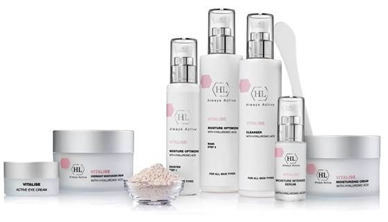 При боротьбі із зморшками незамінними помічниками стануть зволожуючі препарати. Одним з найефективніших зволожувачів є гіалуронова кислота (ГК). Вона має здатність зв'язувати молекули води, що захищає шкіру від втрати еластичності і пружності. З віком природне вироблення ГК знижується. В епідермісі зів'ялої шкіри вона і зовсім відсутня. Гіалуронка, яка міститься в доглядовій косметиці, пом'якшує епідерміс, зменшує кількість тонких ліній і має ефект ліфтингу. При виборі засобів з гіалуроновою кислотою варто звернути увагу на серію Vitalise від Holy Land.